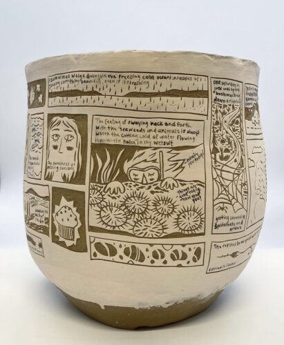 Her functional ceramic works are covered with whimsical comics and illustrations, inspired by everyday magic and the natural world. Handmade in her studio in Vancouver, she uses carving, painting and glazing techniques to imbue colourful narrative worlds into each piece she creates.