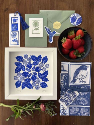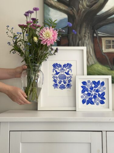 I’m a relief printmaker inspired by botanical symbolism and the timeless elegance of blue-and-white ceramics.